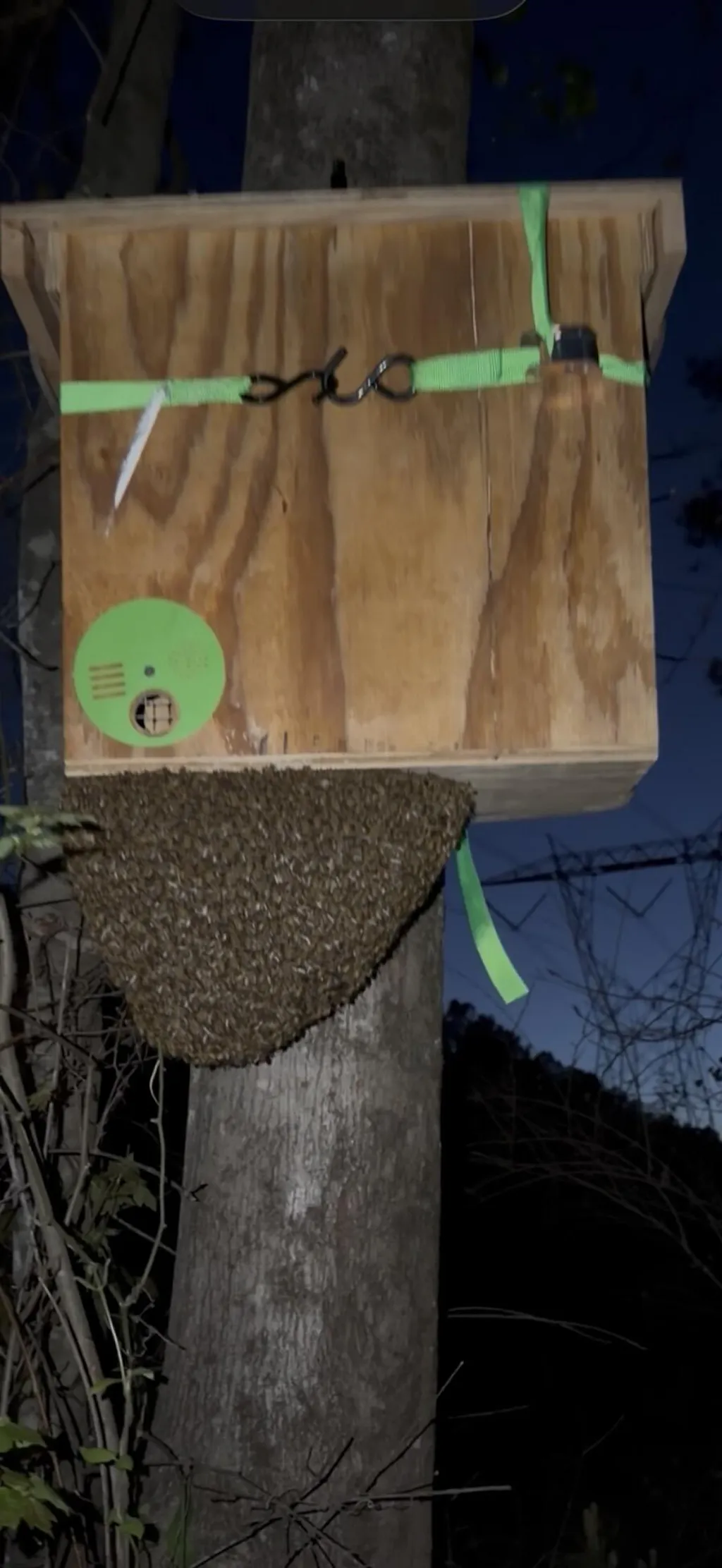 We also offer a really nice optional hanger strap to go with our swarm boxes. This strap allows you to hang the swarm box around a tree of up to 22" diameter, with no nails or damage to the tree. The strap works with our built-in swarm box hanger bracket, is rated for outdoor use, and can hold up to 200 pounds!